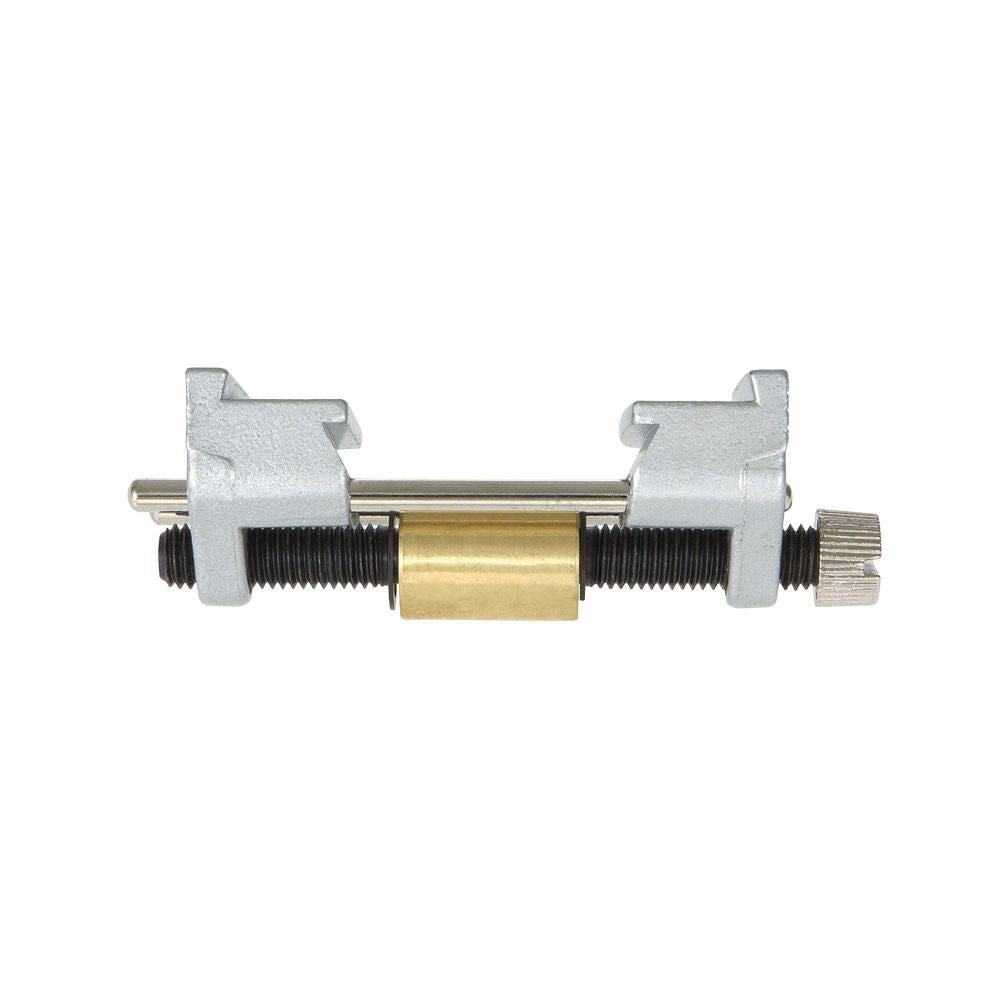 Das Stech- oder Hobeleisen wird seitlich zwischen den beiden Backen eingeklemmt und mit der breiten Messingrolle über den Schleifstein bewegt.